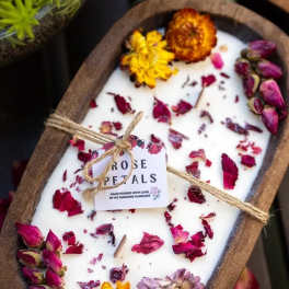 Price: $50.00 Dough Bowl Rose Petals Candle with Wood Wick and Soy Wax Product Tags: Next-day Delivery